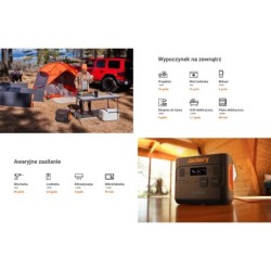 Przenośna stacja zasilania Jackery Explorer 2000 Pro zapewnia ogromną pojemność akumulatorów (2160 Wh) i może zasilać wiele urządzeń, w tym płyty grzejne, blendery, klimatyzatory i inne. Idealne rozwiązanie do aktywności na świeżym powietrzu, gdzie nie ma dostępu do sieci elektrycznej (kemping lub kamper) i domowego zasilania awaryjnego. Super szybkie ładowanie Stację zasilania można naładować z gniazdka sieciowego w zaledwie 2 godziny, a z gniazda samochodowego 12V w 24 godziny. Bezpieczeństwo premium Wysokiej jakości bateria litowa zawiera dwa chipy do podwójnej ochrony baterii i cztery czujniki temperatury rdzenia. Dla jeszcze większego bezpieczeństwa i niezawodnego procesu ładowania. Doskonałe ładowanie przelotowe Bank energii obsługuje ładowanie przelotowe. Pozwala to na ładowanie go, gdy jednocześnie podłączone są urządzenia odbiorcze. Szybki i wygodny proces ładowania wszystkich Twoich urządzeń. Zastosowania Awaryjne zasilanie w domu Zasilanie urządzeń turystycznych Wyposażenie kabel do ładowarki samochodowej kabel do ładowania AC instrukcja obsługi Specyfikacja techniczna INFORMACJE O BATERII Pojemność: 2160Wh (43,2V, 50Ah) chemia komórkowa: Li-ion NMC Cykle ładowania: ≥1000 cykli do 80% System zarządzania: BMS, ochrona przed przegrzaniem, ochrona przed przepięciem, ochrona przed zwarciem, ochrona przed przeładowaniem PORTY Wyjście AC (x2): 230V, 2200W (szczyt 4400W) Wyjście USB-A (x2): Szybkie ładowanie 3.0, 18W (maks. 5-6V, 3A / 6-9V, 2A / 9-12V, 1,5A) Wyjście USB-C (x2): 100W maks., 5V, 9V, 12V, 15V, 3A / 20V, 5A Wyjście samochodowe (x1): 12V, 10A Wejście AC: 230V, 50Hz, maks.10A Wejście prądu stałego: maks.11 V - 17,5 V, 8 A , podwójna maks. 8 A 17,5V – 60V, 12A, podwójna maks. 24A/1400W CZAS ŁADOWANIA Zasilacz sieciowy: około 2 godzin Zasilacz samochodowy 12V: około 24 godzin 6 paneli słonecznych SolarSaga 200W: około 2,5 godziny 4 panele słoneczne SolarSaga 200W: około 4 godzin 2x Panele Solarne SolarSaga 200W: około 7,5 godziny OGÓLNE Waga: 19,5 kg Wymiary (DxSxG): 38,4 x 26,9 x 30,75 cm Gwarancja: 24 miesiące Temperatura użytkowania podczas pracy: -10 - 40°C (14-104°F) Akcesoria opcjonalne: Panel słoneczny SolarSaga 200 (sprzedawany oddzielnie)