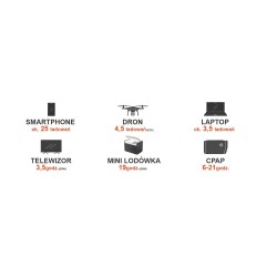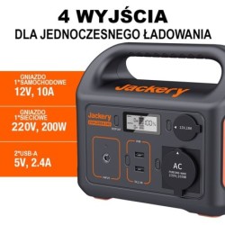 Podstawowy model do zastosowań zewnętrznych. Jackery Explorer 240 to przenośny bank energii z solidnym uchwytem, łatwy do przenoszenia i obsługi w dowolnym miejscu. Wystarczająca moc, aby zasilać smartphone'a, laptopa i inne urządzenia, gdy spędzasz weekend na biwaku. Do podstawowych zastosowań Pojemność baterii 240 Wh (16,8 Ah, 14,4 V), moc znamionowa 200 W i moc max 400 W Wiele portów wyjściowych Do zasilania wielu urządzeń, takich jak telefon, laptop, światło, wentylator itp. Zastosowania Ładowanie z wyjścia DC: Lodówka samochodowa (40 W) około 19 godz., Dron około 4,5 ładowań Ładowanie z wyjścia AC: 12" laptop (30W) około 3,5 ładowań, 32" TV (60 W) około 3,5 godz. Wyjścia USB: smartphone (18 W ) około 25 ładowań, kamerka sportowa około 45 ładowan Wyposażenie kabel ładowarki samochodowej AC & AC kabel (2 elementy ) Instrukcja obsługi Specyfikacja techniczna Pojemność akumulatora: 16,8 Ah Moc ciągła: 200 W Moc maksymalna: 400 W Wyjście AC: 230V / 0,87A Wyjście USB-A: 2x 5 V / 2,4 A Wyjście samochodowe DC: 1 x 12 V / 10 A Wymiary dł./szer./wys. [mm]: 230 / 142 / 200 Waga [kg]: 3